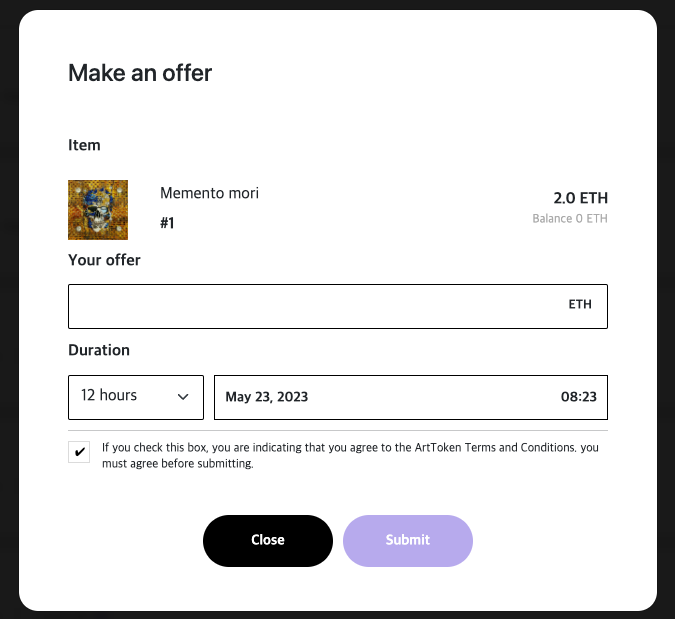 2. "Offer"를 누른 후에 모달 창이 나타납니다. 제안할 ETH 금액을 입력하세요(ETH로만 제안할 수 있습니다).